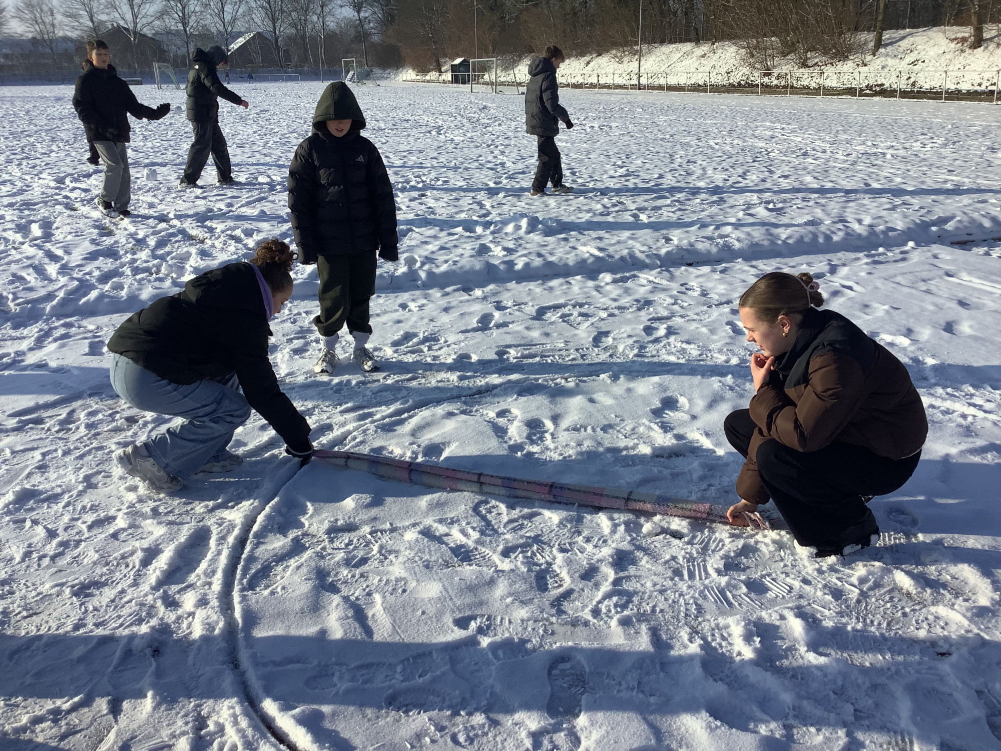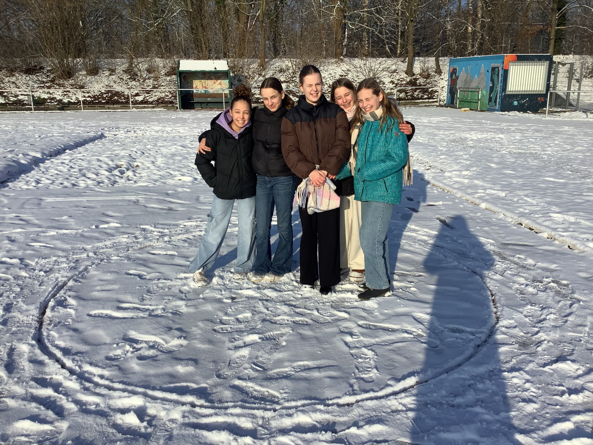 Die Klasse 6c durfte heute den Mathematikunterricht nach draußen verlegen: Im frisch gefallenen Schnee erkundeten die Schülerinnen und Schüler spielerisch die Eigenschaften des Kreises. Mit viel Begeisterung versuchten sie, den perfekten Kreis in den Schnee zu zeichnen. Besonders kreativ wurde es dabei, als einige Kinder kurzerhand ihren Schal als Radius nutzten. So wurde Mathematik anschaulich, bewegungsreich und machte allen sichtlich Spaß. (Lena Kaufmann)